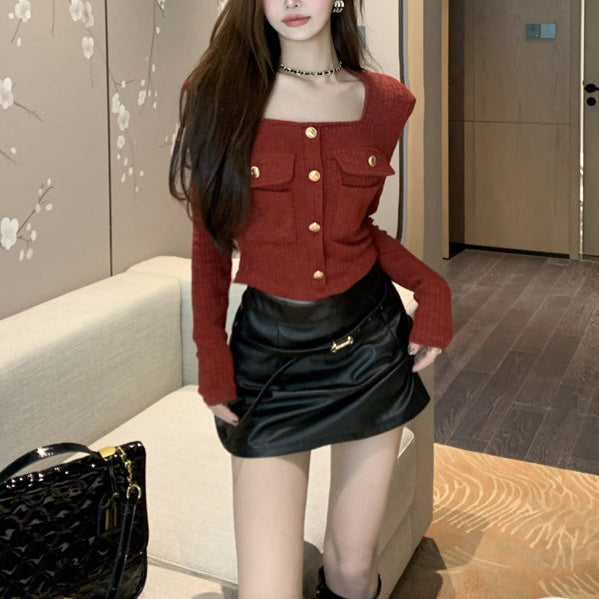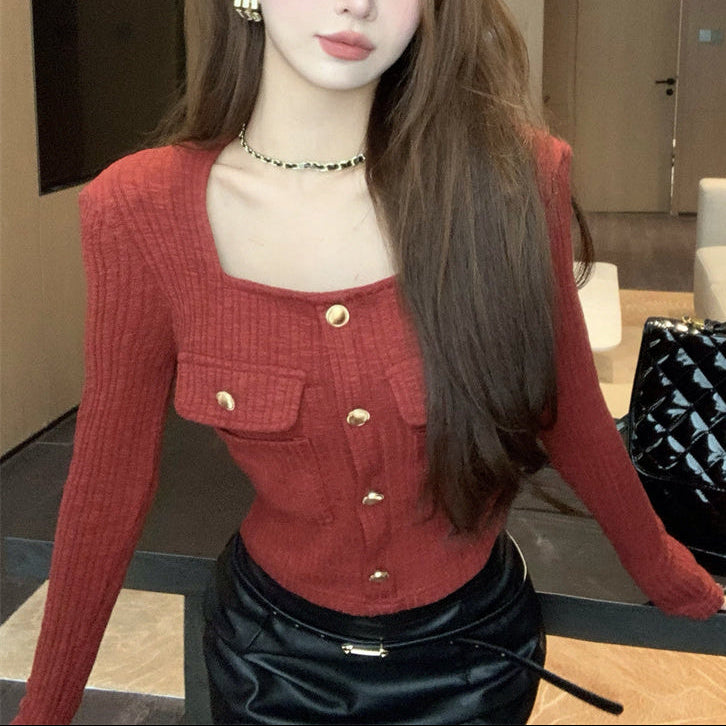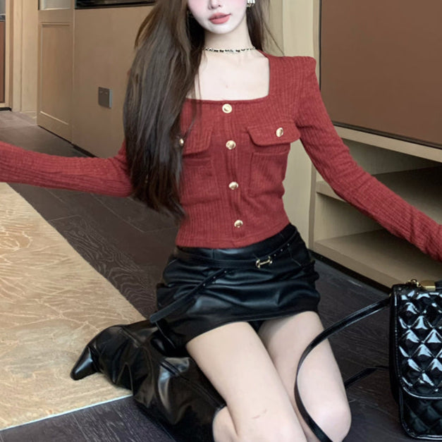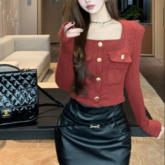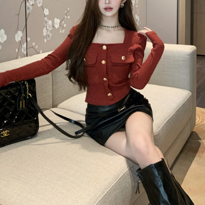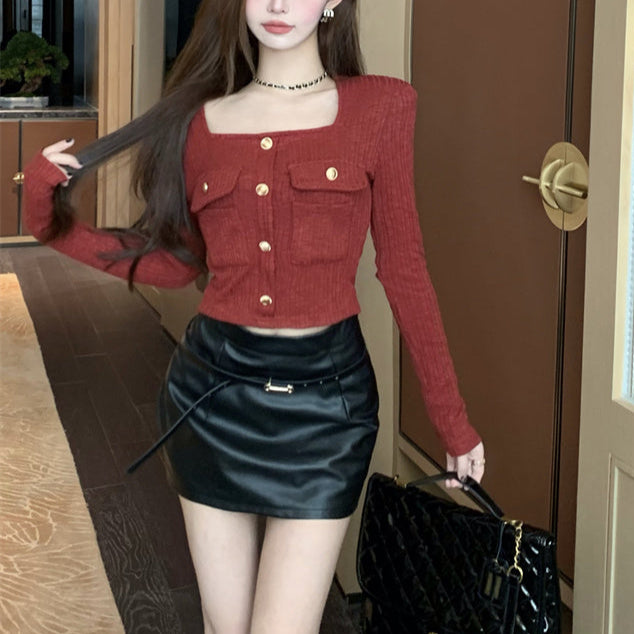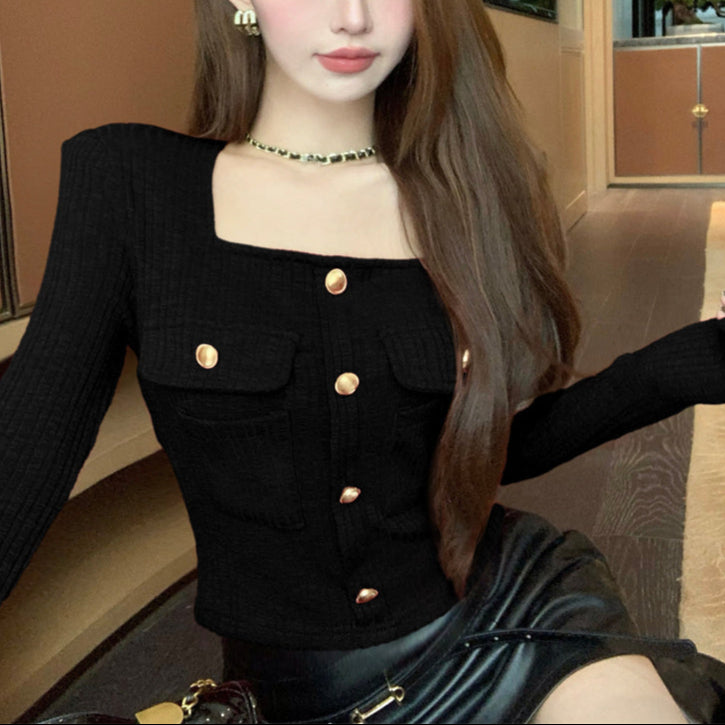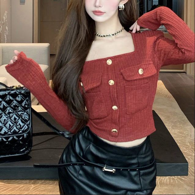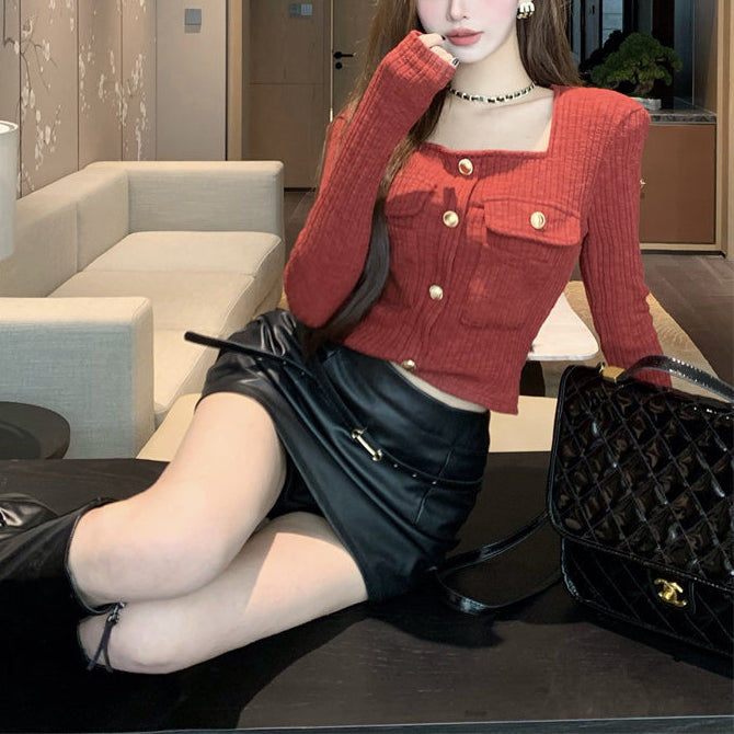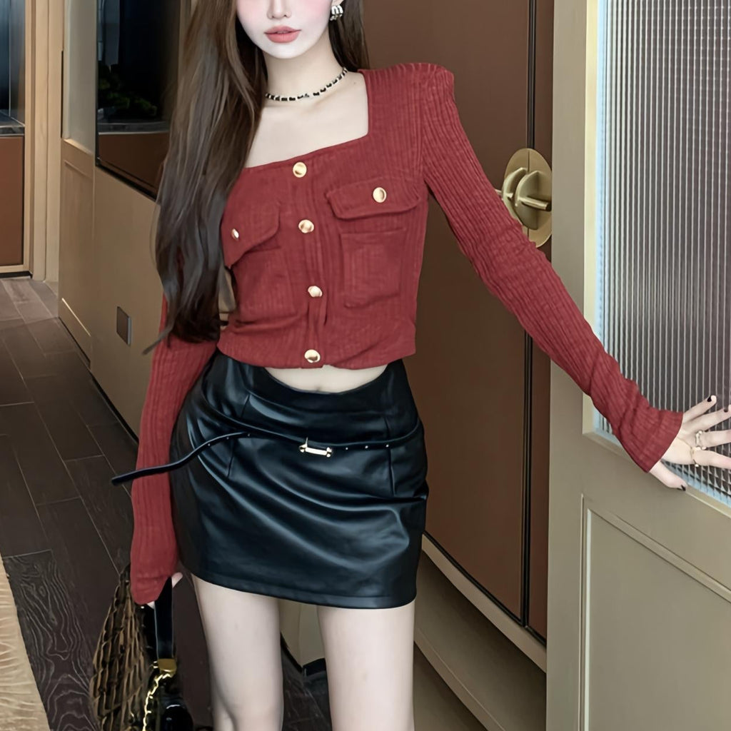 ・スクエアネックでデコルテラインが綺麗に見えるショートトップス。