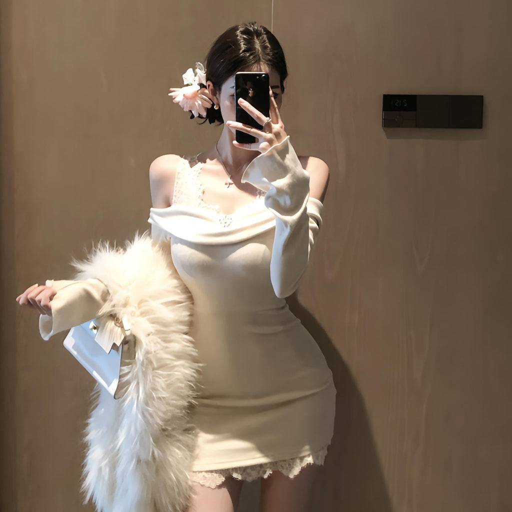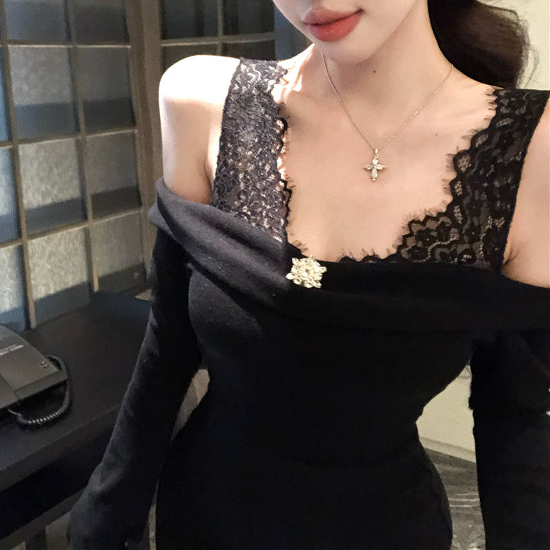 ・裾とショルダー部分にレースがついていてレイヤード風になったデザインです。