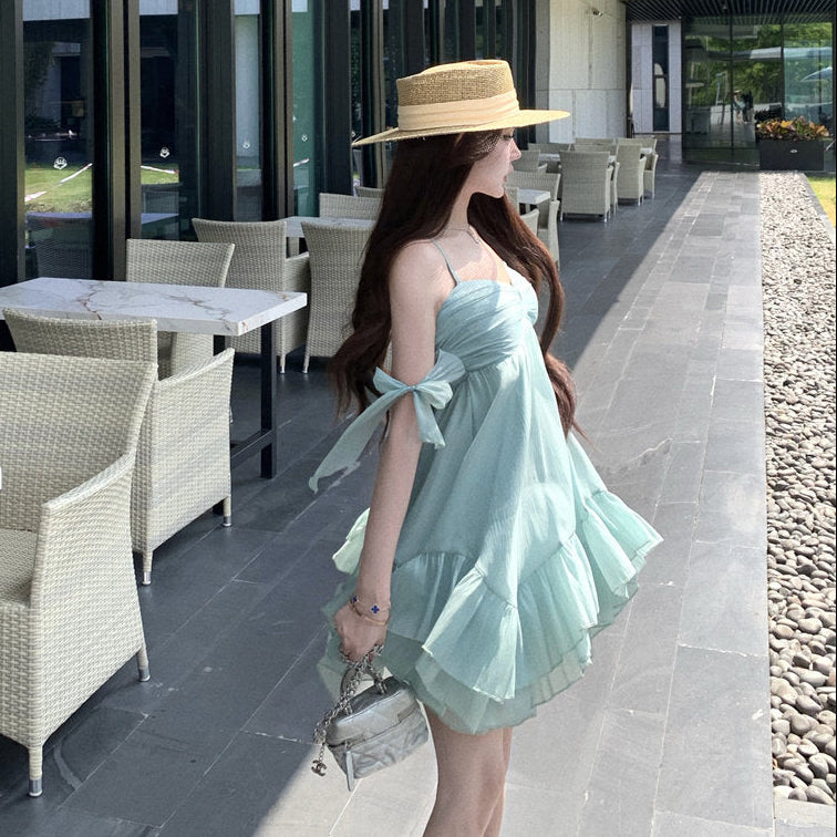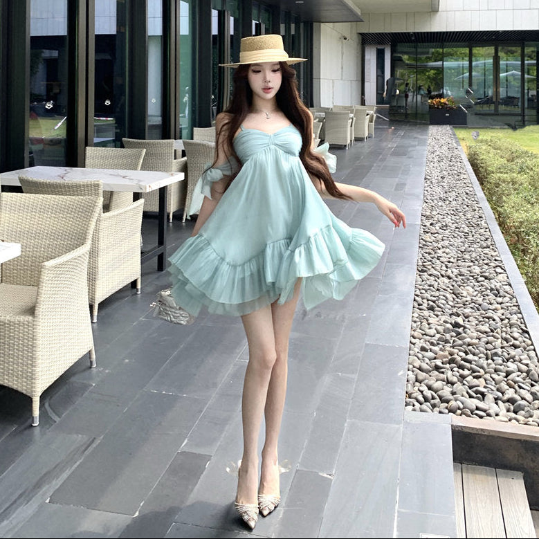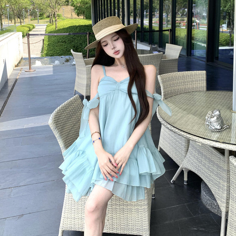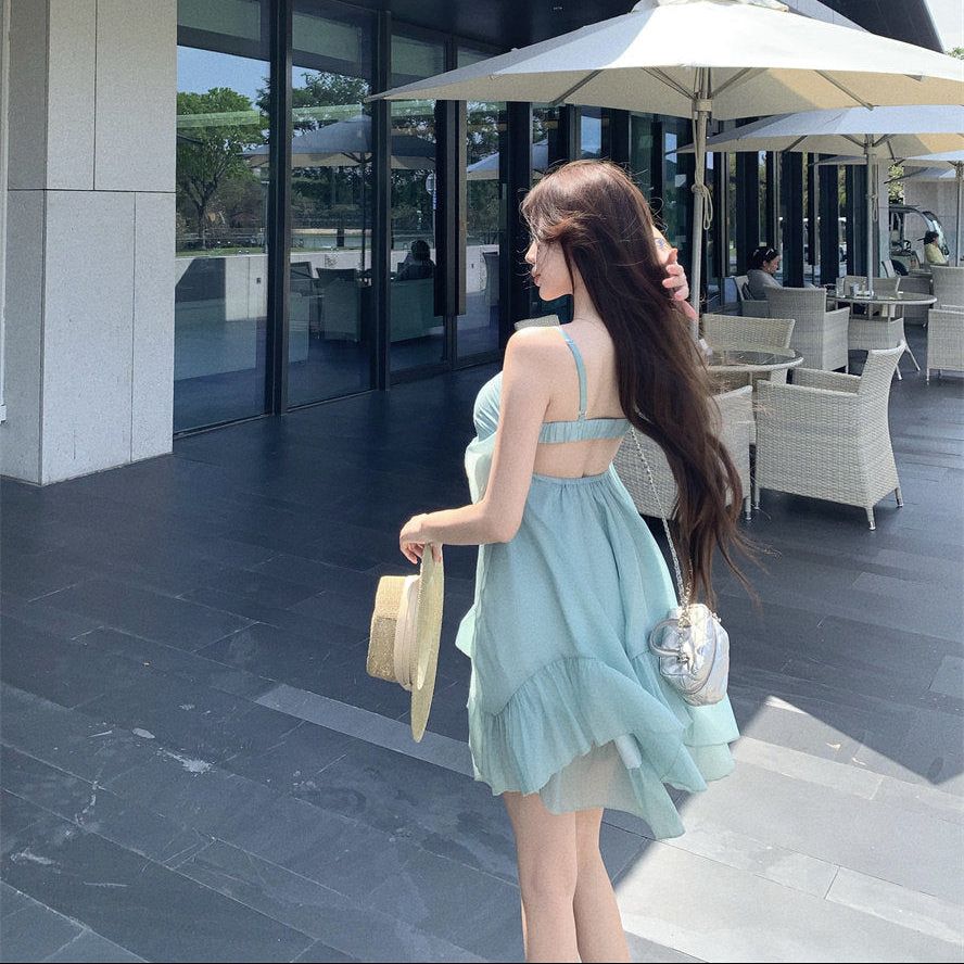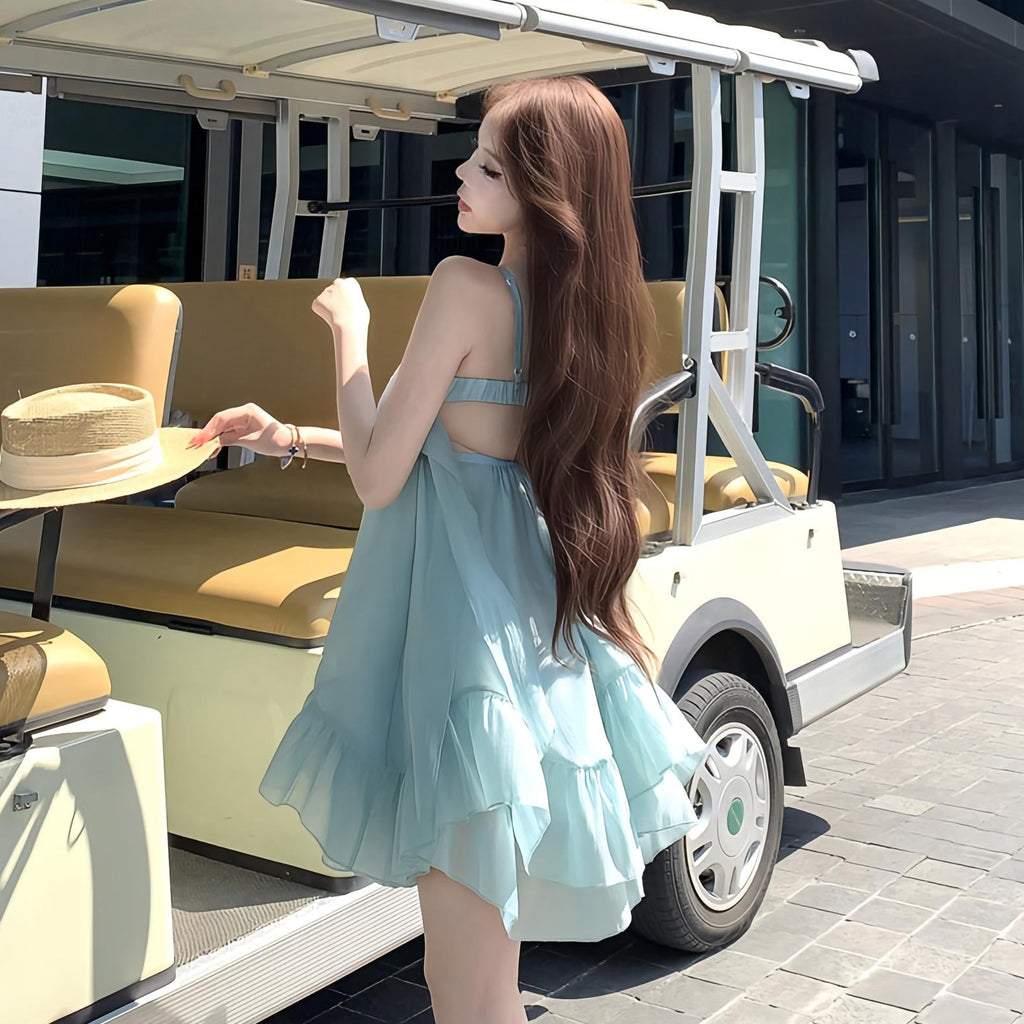 ・リゾートシーンで映えるAラインミニワンピース。