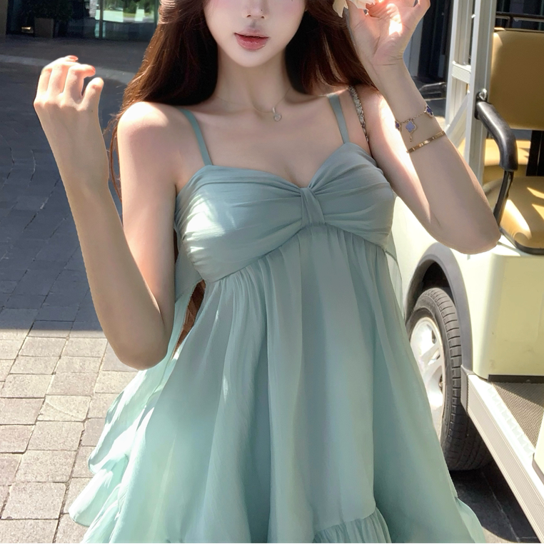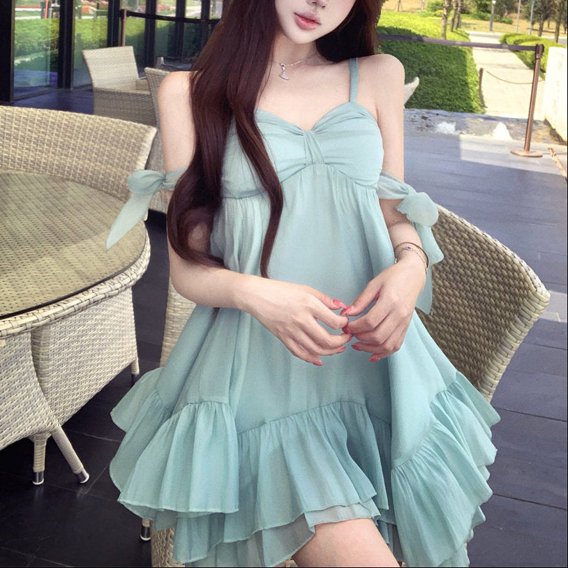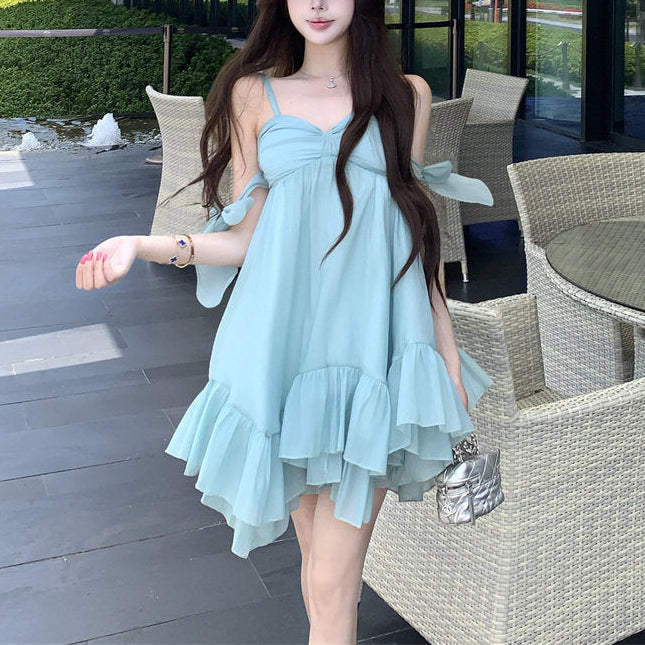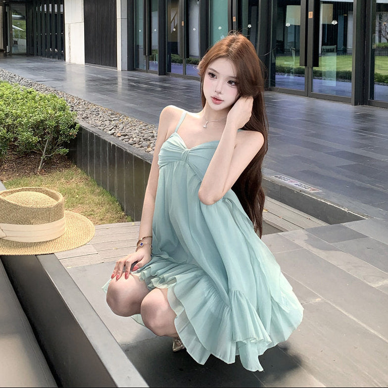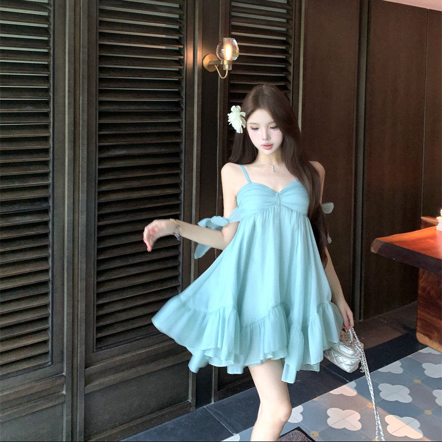 ・リゾートシーンで映えるAラインミニワンピース。
