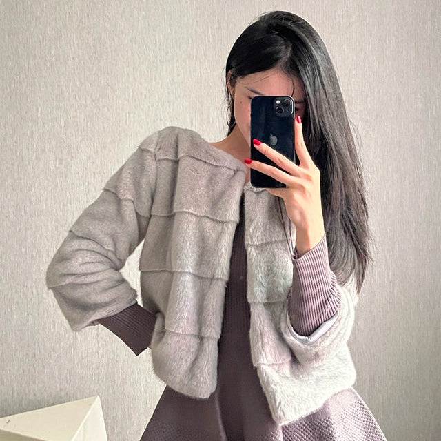 ・袖が7部丈なのでエレガントに着こなせるノーカラーファージャケット。
