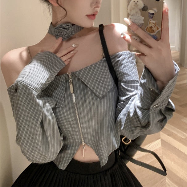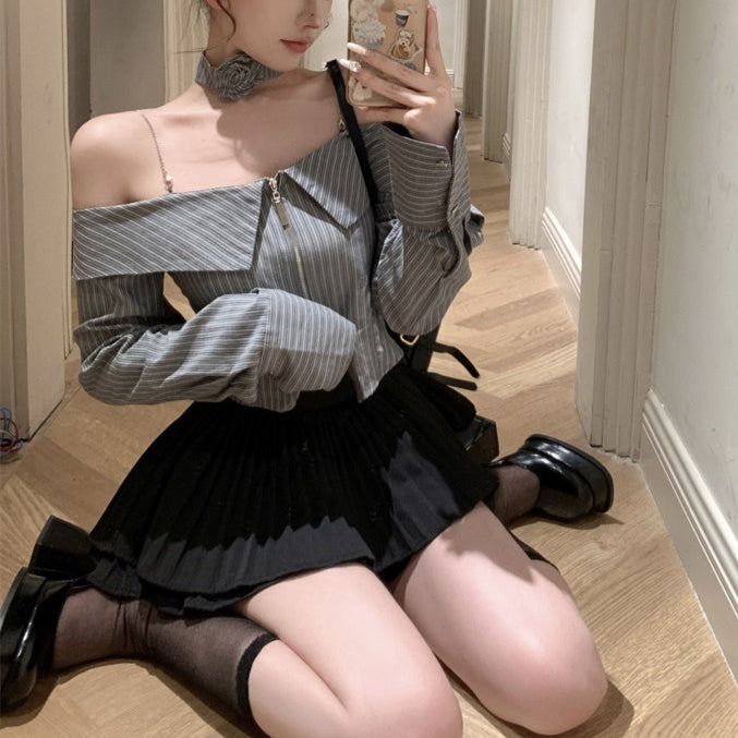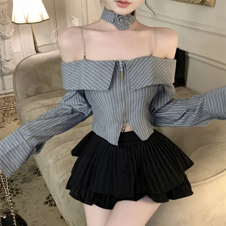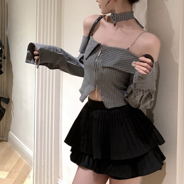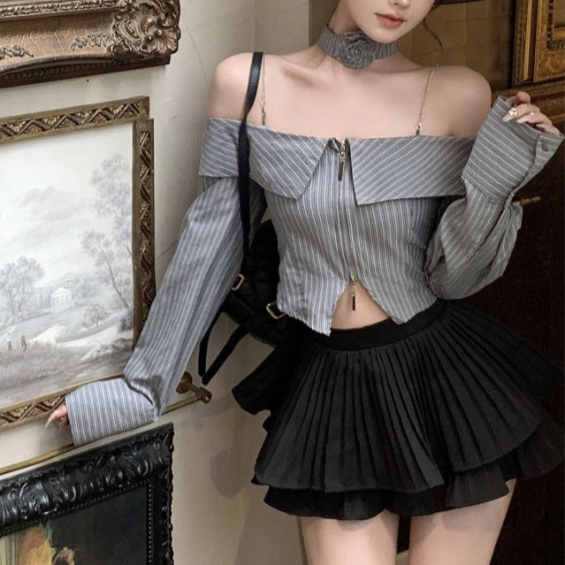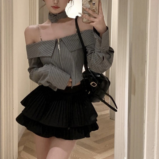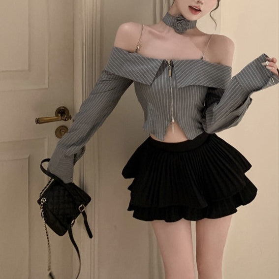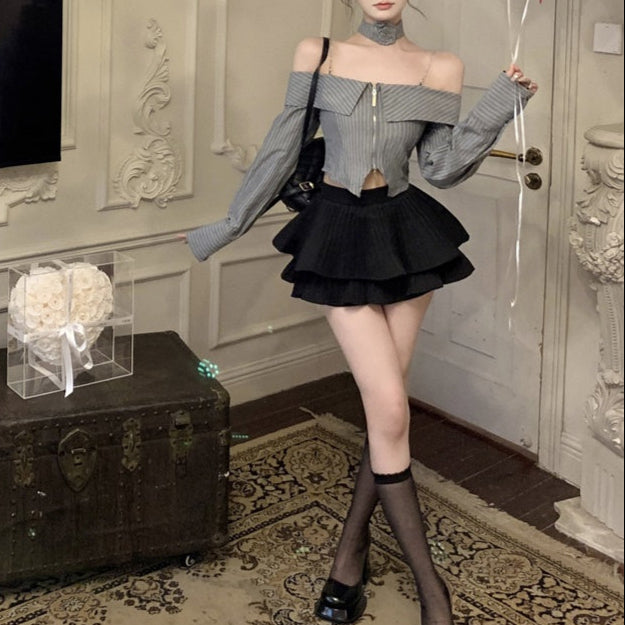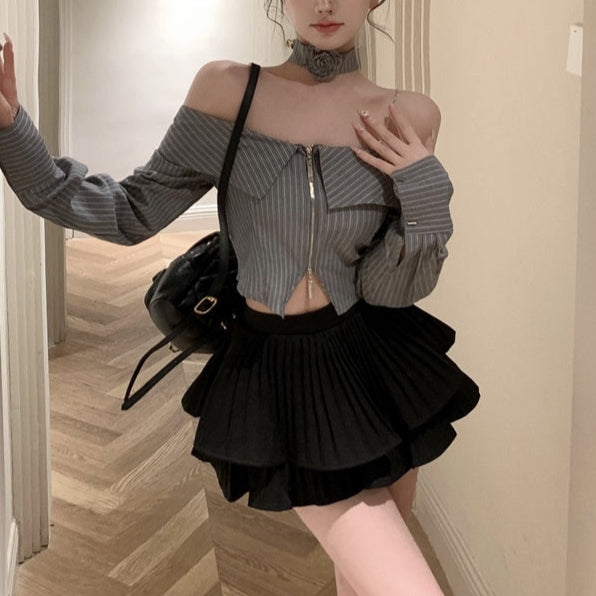 ・オフショルデザインのストライプブラウスにティアードフリルのスカートがセットになったITEMです。