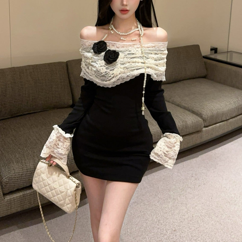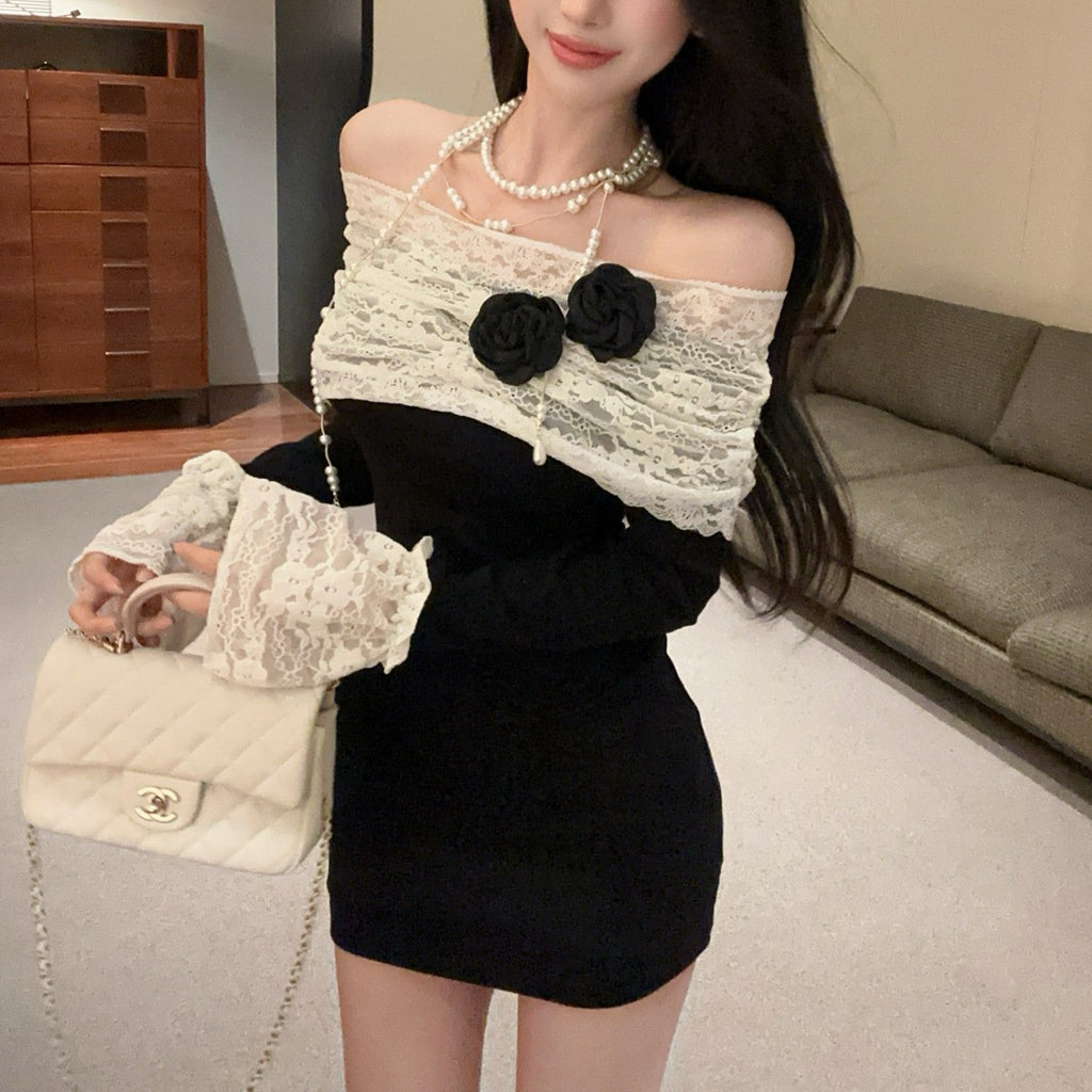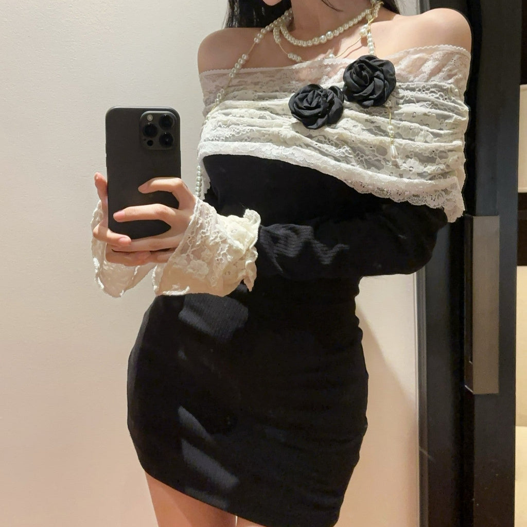 ・袖口とデコルテ部分がレース使いがポイントのオフショルワンピース。