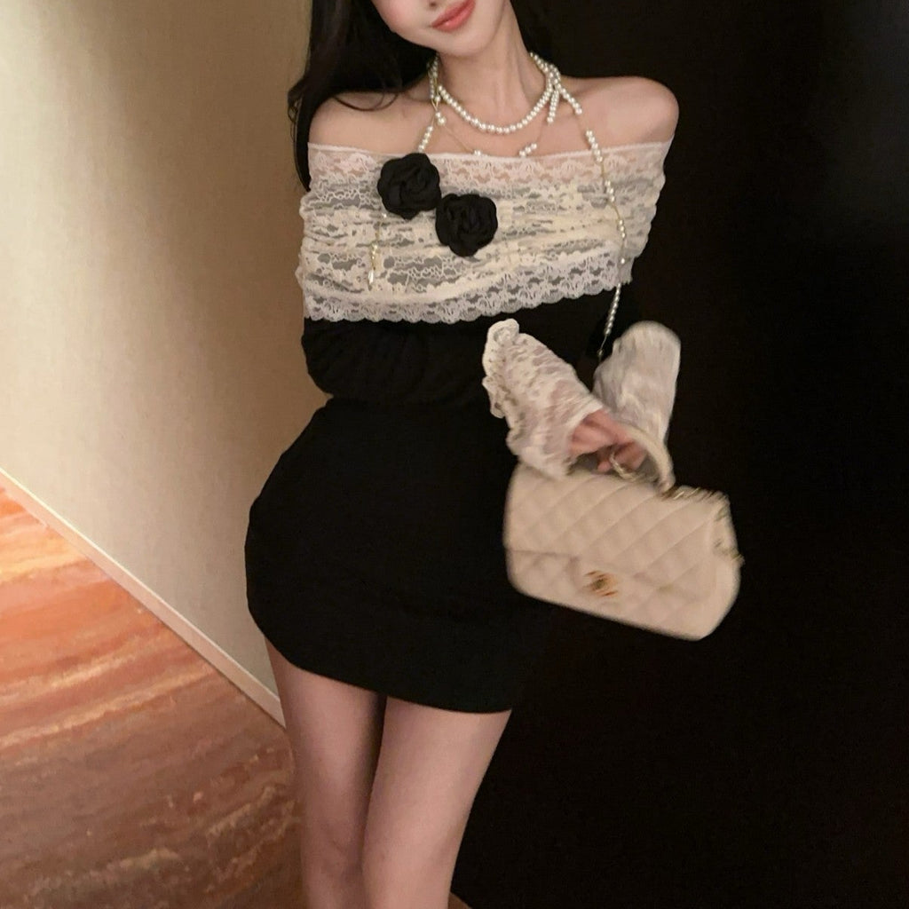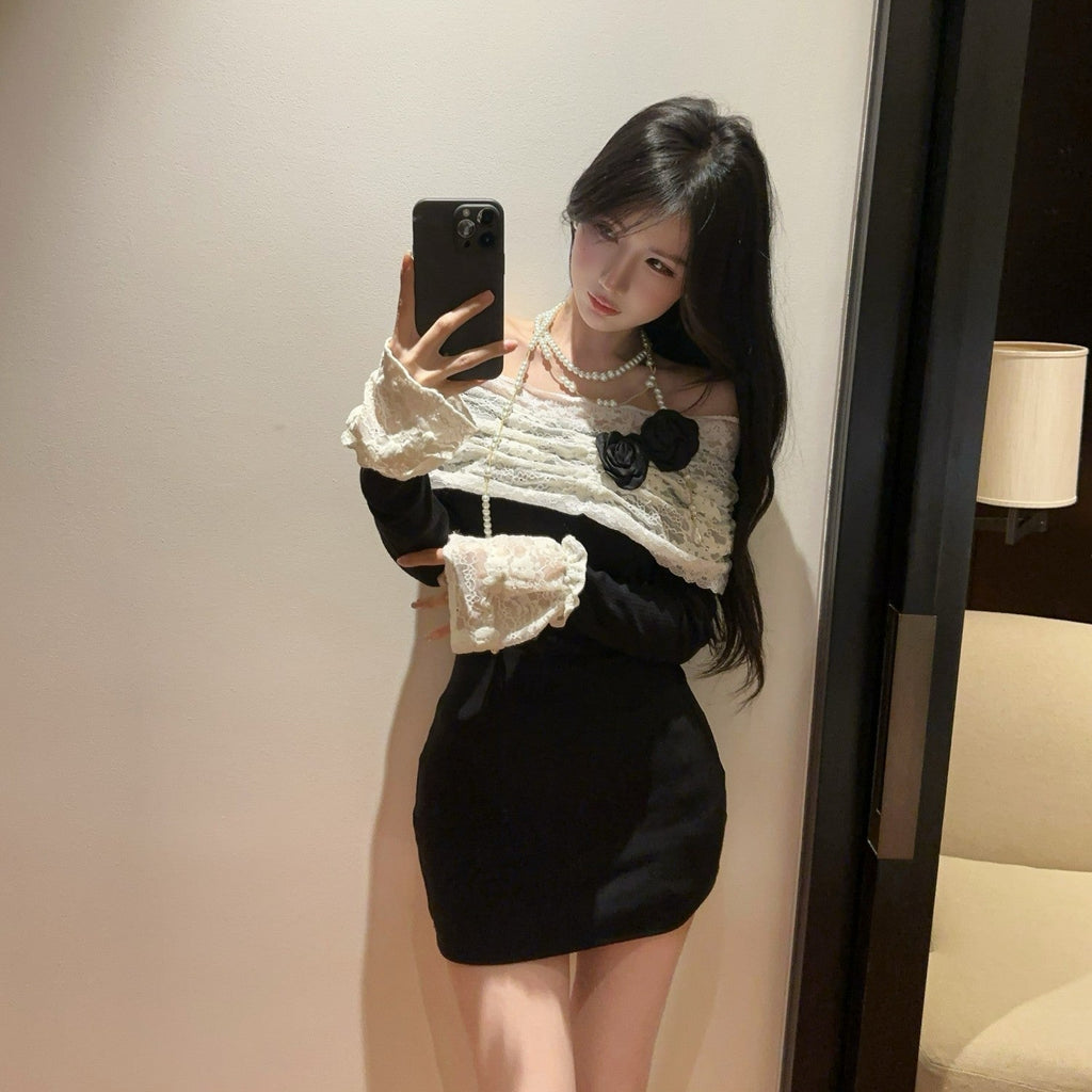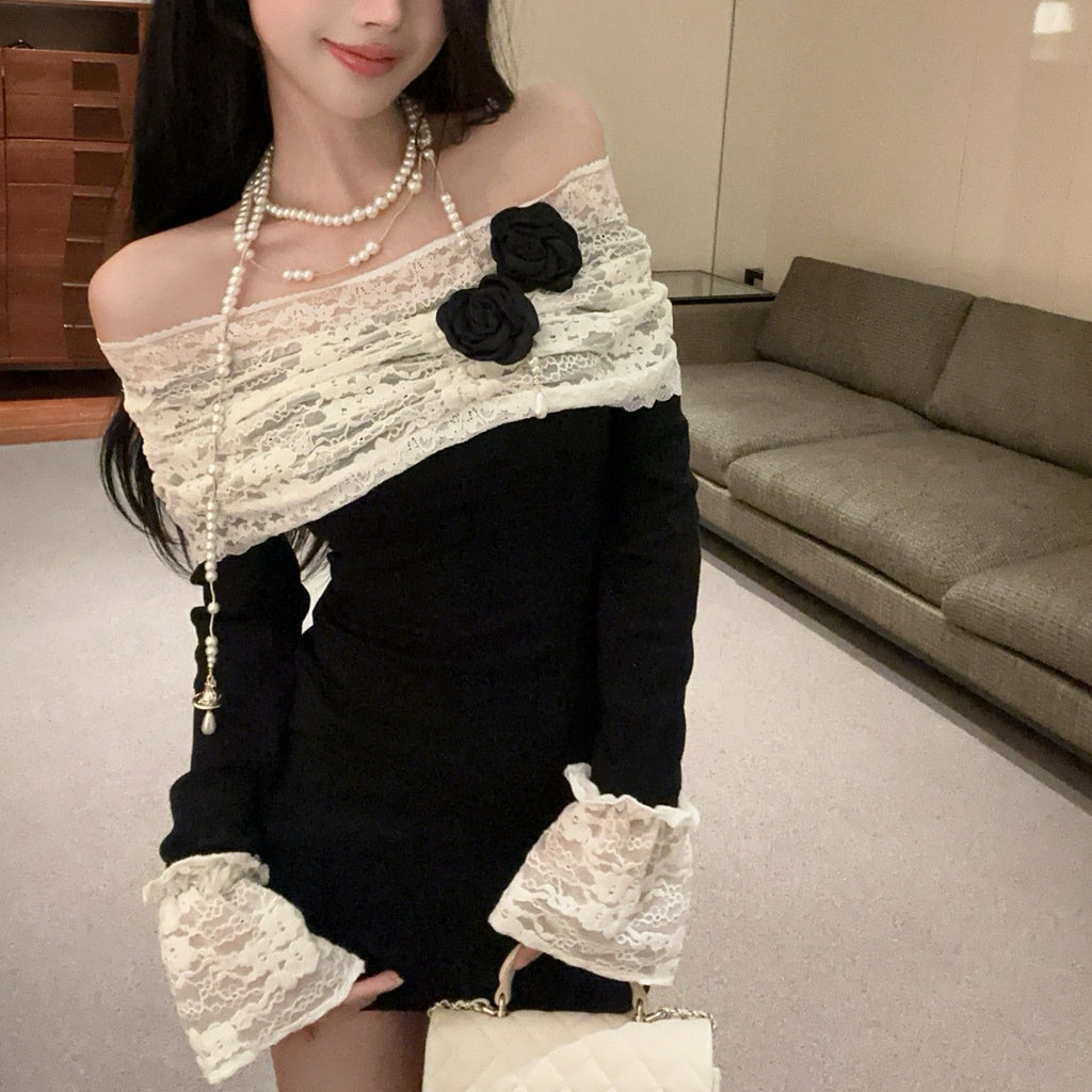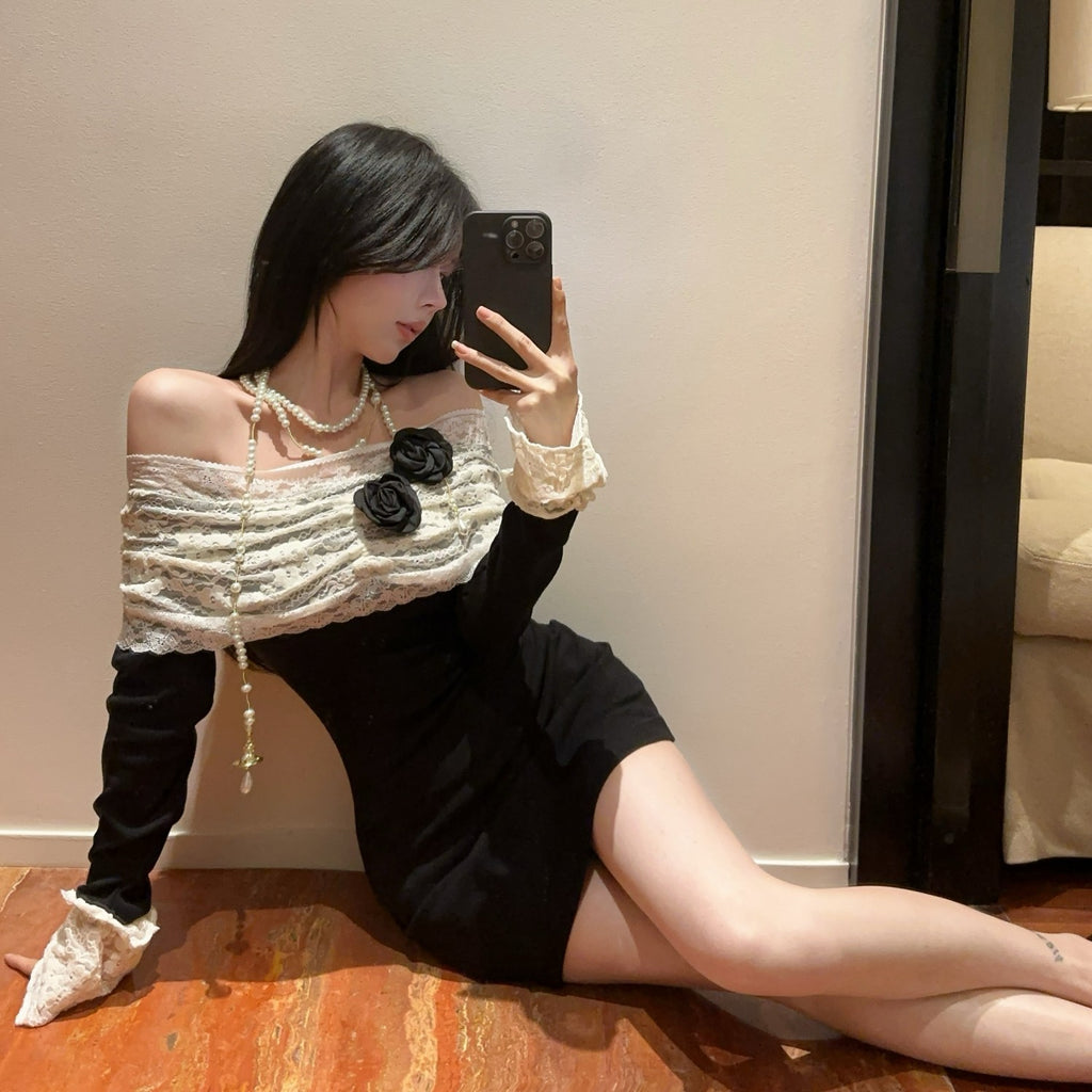 ・袖口とデコルテ部分がレース使いがポイントのオフショルワンピース。
