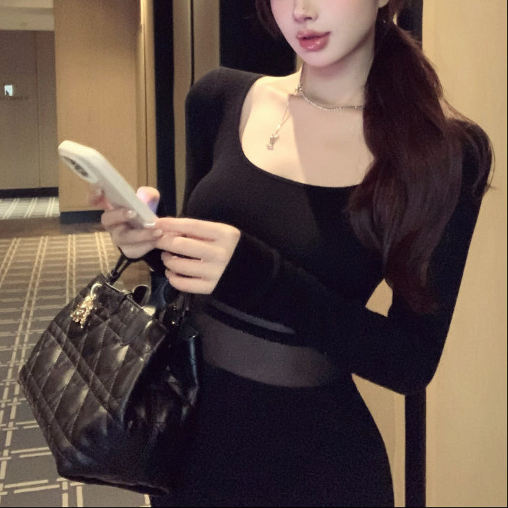・ウエスト部分がシースルーになっていてエロみ感のあるミディ丈ワンピース。