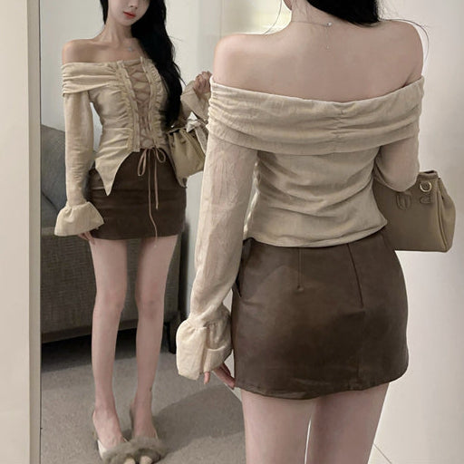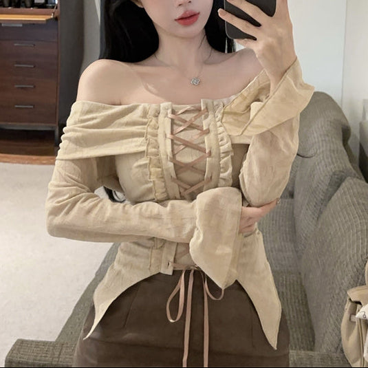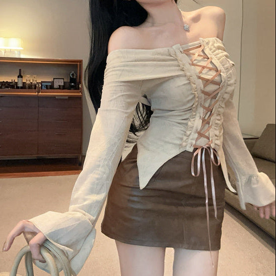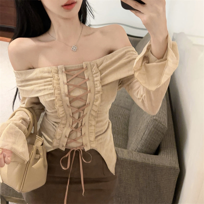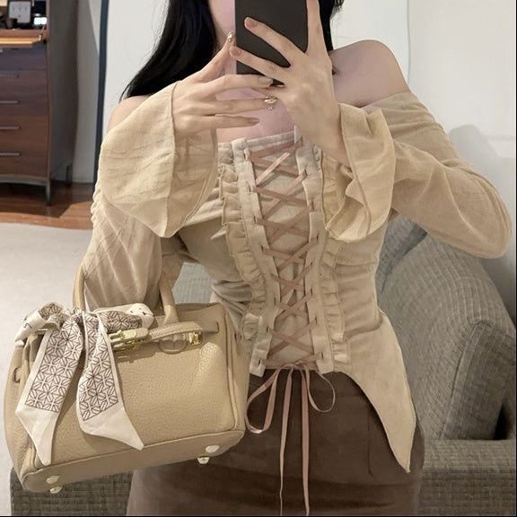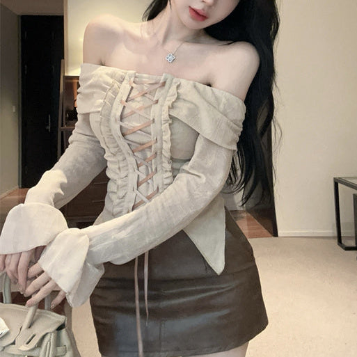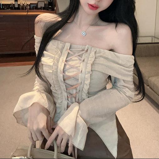 ・フロント部分の編み上げレースアップが可愛いオフショルトップス。