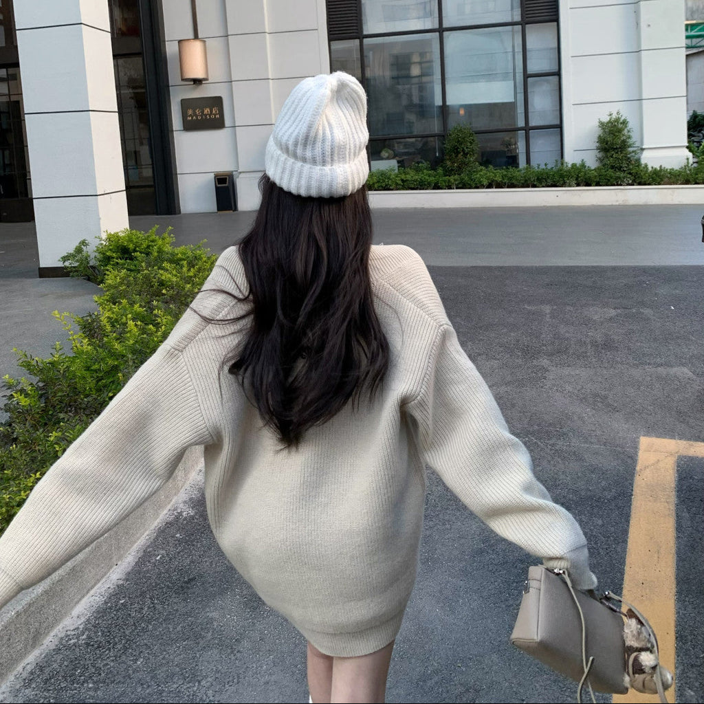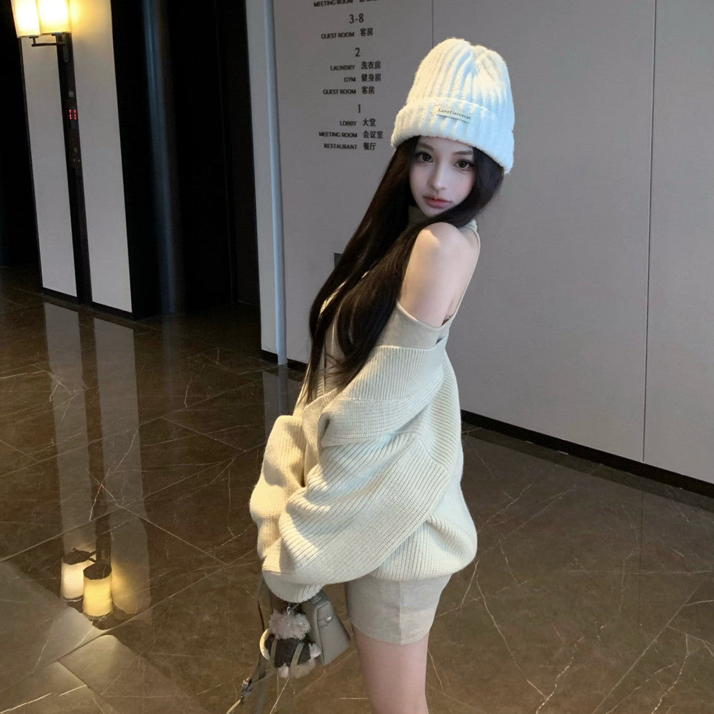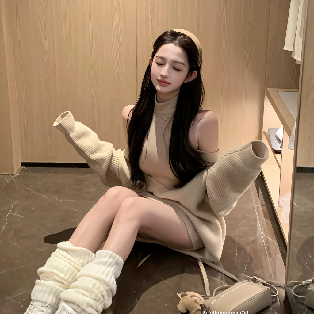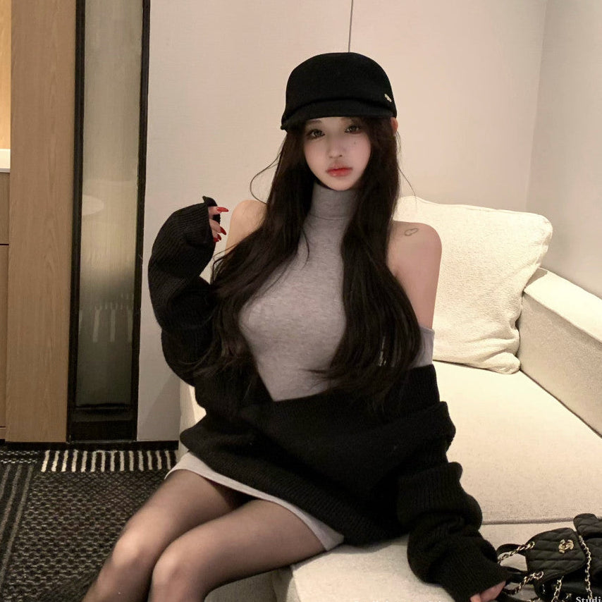 ・タイトなカットソーワンピとゆったりニットのバランスが可愛い♡